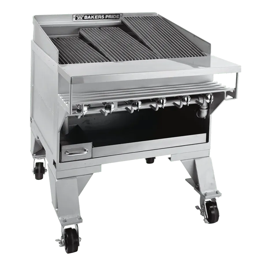 The Bakers Pride® model CH-6 charbroiler is the perfect choice for high-volume broiling. It is constructed of extra heavy-duty plate steel for durability, and each of the six burners has an output of 18,000 BTUH for energy efficiency yet high production. This model features cast-iron top grates, but you can also select other grate types such as floating rods and meat grates at no extra charge. Grates may be adjusted in three separate titling positions for increased flexibility and temperature control. Heavy-duty, stainless steel radiants come standard or can be substituted for cast iron. For even more versatility, choose from a wide variety of options, such as Glo-Stones and log holders for added flavor or casters for mobility. This charbroiler can also be built in with stone, brick, or masonry for exhibition kitchens.