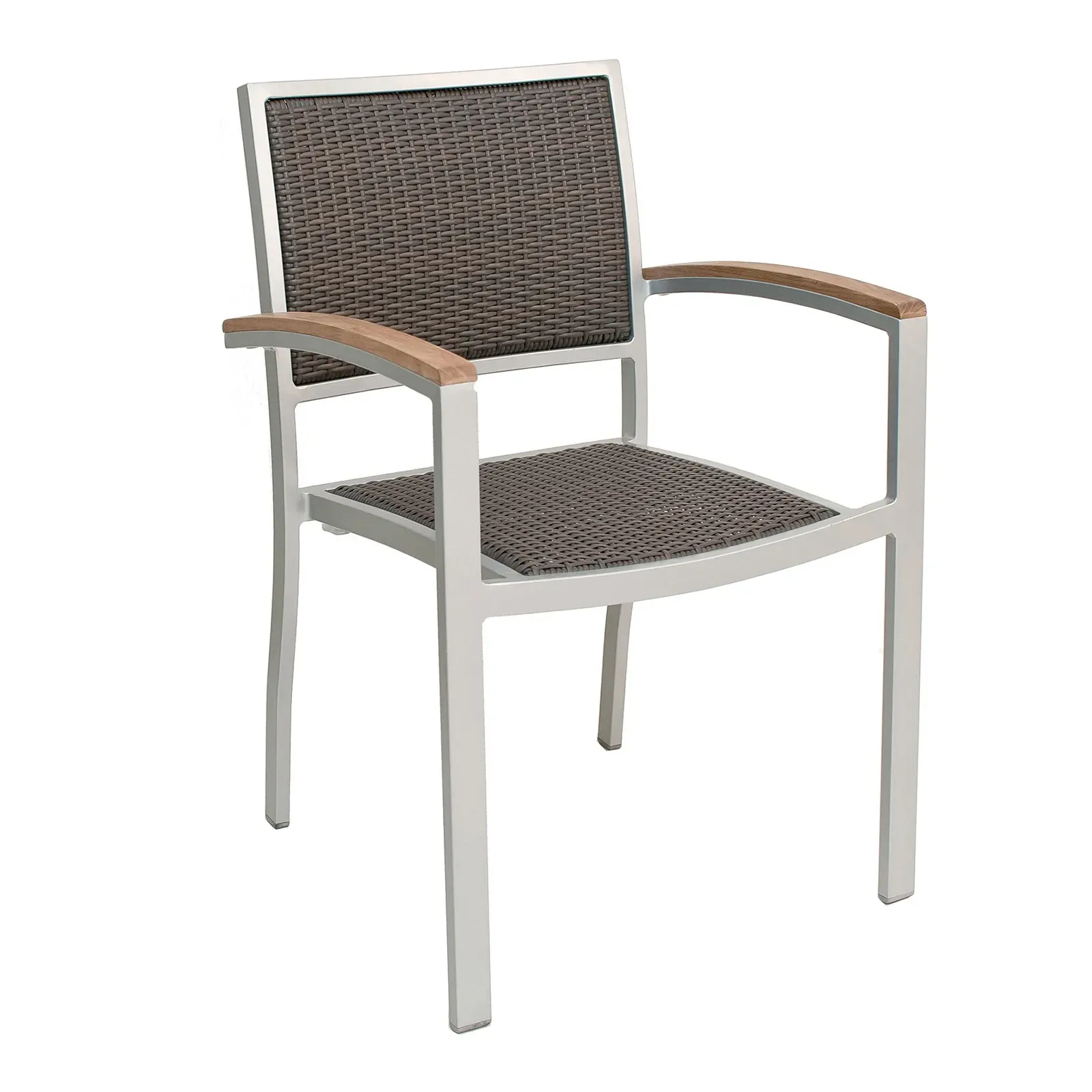 Ensure comfort without compromising on style using the Florida Seating AL-5625 Armchair. Designed specifically for outdoor use, this stackable armchair is perfect for commercial restaurants looking to create a stylish and comfortable outdoor seating area. The chair features a polyethylene weave back and seat, providing both durability and comfort. The faux teak armrest adds a touch of elegance, while the aluminum frame with a powder coat finish ensures long-lasting use. With its UV-resistant construction, this armchair can withstand the elements and maintain its vibrant color. Whether you're setting up a patio dining area or a rooftop bar, the Florida Seating AL-5625 Armchair is a versatile and practical choice. Elevate your outdoor dining experience with this high-quality armchair.