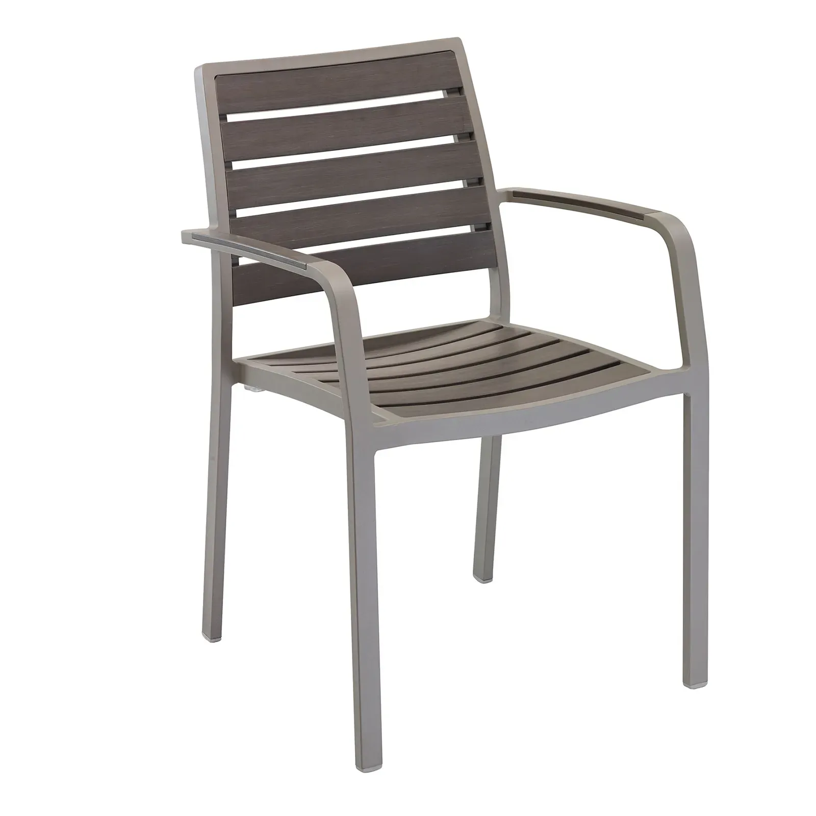 Adapt to varying needs with versatile solutions using the Florida Seating AL-5700-A Chair. Designed specifically for commercial restaurant use, this armchair offers both style and functionality. The stackable design allows for easy storage, making it ideal for establishments with limited space. The gray faux teak ladder back and seat provide a modern and sophisticated look, while the armrests offer added comfort for guests. Constructed with aluminum and finished with a gray powder coat, this chair is built to withstand outdoor use, ensuring durability and longevity. Whether you're creating an outdoor dining area or updating your indoor seating, the Florida Seating AL-5700-A Chair is a reliable choice. With its sleek design and practical features, this armchair is sure to enhance the ambiance of any commercial restaurant setting.