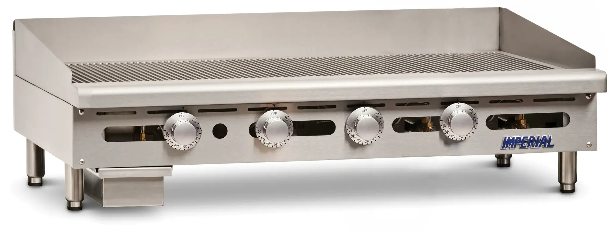 Fuel your restaurant's success with the Imperial IGG-48 Gas Countertop Griddle. This high-quality griddle is designed to meet the demands of a busy commercial kitchen. With a spacious 48" W x 24" D cooking surface, you'll have plenty of room to cook multiple items at once. The 1" thick grooved plate ensures even heat distribution and excellent heat retention, allowing you to achieve perfect results every time. The thermostatic controls give you precise temperature control, while the 4" wide grease gutter and removable grease can make cleanup a breeze. Made with durable stainless steel, this griddle is built to withstand the rigors of a busy kitchen. With a powerful 120,000 BTU burner, this griddle delivers the heat you need to cook your dishes quickly and efficiently. Trust Imperial for all your commercial kitchen needs.